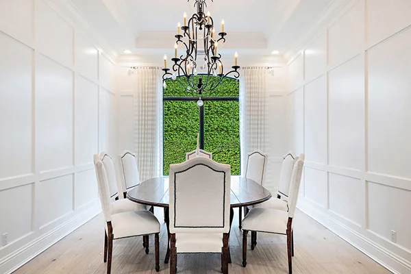 The dining room in this home welcomes guests with a dome ceiling and vaulted windows to allow in plenty of natural light with a view of its private garden.