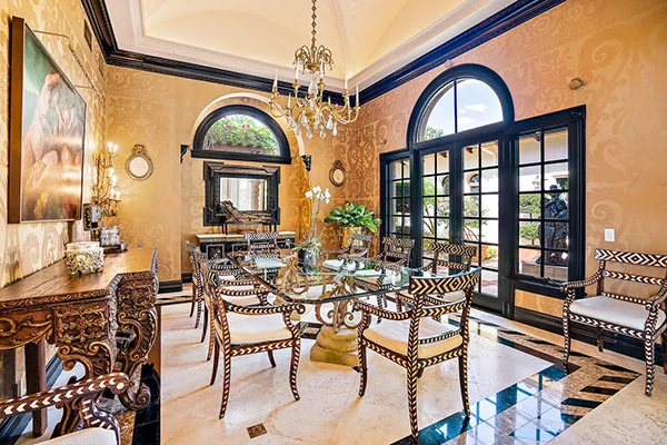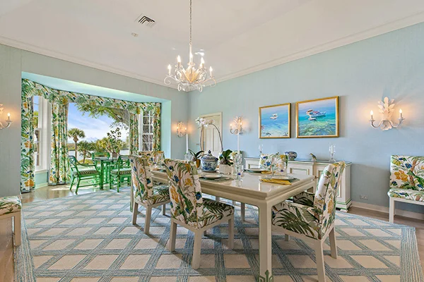 This Jupiter Island dining room on the intracoastal compliments Florida’s lush landscaping with tropical print chairs to match the drapes, and energetic splashes of green and blue.
