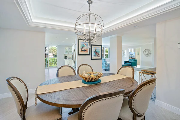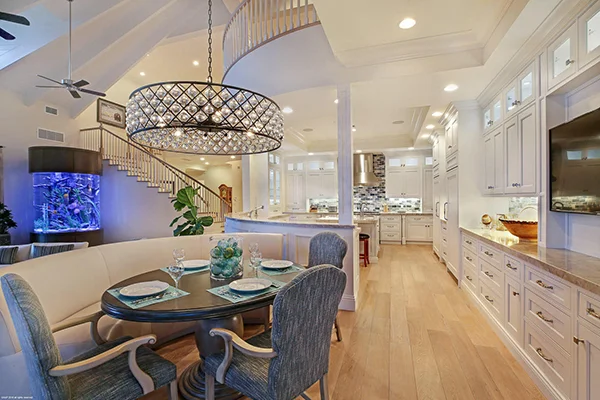 This contemporary intracoastal front dining area features a social kitchen, subtle blue tones, and is decorated by the current owner with a beautiful saltwater aquarium.