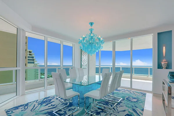 A Bahama blue chandelier and glass table match the color of the ocean view in this beachside condo.