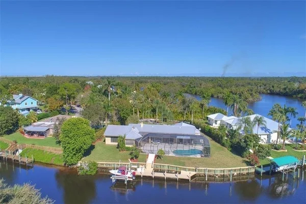 Excellent deepwater dockage home one house in from the river with a partial view. The kitchen was updated with beautiful solid cherrywood cabinets and granite countertops. The master bath was also beautifully updated. A judicious inspection of this home reveals the love and care that was put into it over the years with features such as the Murphy Bed/Desk combos in the office and the extra outside storage buildings that were built onto the sides of the house and blend in nicely. The spacious and versatile layout with a huge pool/patio area and spa are perfect for entertaining!