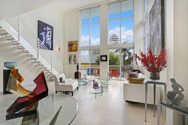 Absolutely stunning and complete renovation of a highly desirable corner unit in the Lake Worth Lofts. From imported Italian porcelain floors to hand finished wood work by European craftsman this unit is without peer. The light infused loft has floor to ceiling wrap-around windows reaching 20 feet in height allowing for wide ranging views of Lake Worth both to the East and to the South. Specialty blinds were manufactured to reduce light with maximum heat resistance as needed, but still allow for brightness throughout the first floor.